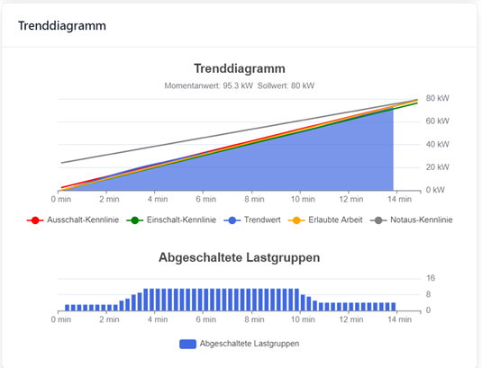 Die vorausschauende, trendrechnungsbezogene Spitzenlastoptimierung erkennt frühzeitig, ob der Sollwert nach 15 Minuten erreicht werden kann. Bei prognostizierter Überschreitung werden die niedrigsten Prioritäten geregelt und getaktet. Dieser Vorgang wird wiederholt und auf weitere Lastgruppen angewendet, sodass keine Überschreitung eintritt.