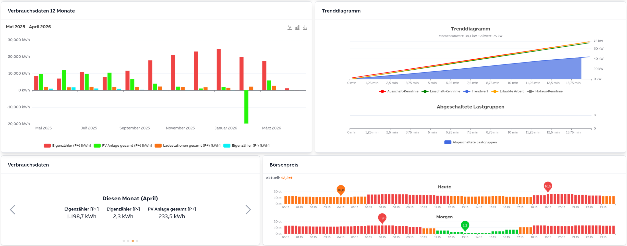Damit gelingt es, durch mehrere parallel laufende komplexe Rechenalgorithmen, zwischen notwendigem Verbrauch und unnötigen Leistungsspitzen zu unterscheiden. Durch alle veränderbaren Parameter kann das Regel- und Schaltverhalten an den jeweiligen Betrieb, die individuellen Gegebenheiten und an die verschieden Verbraucher ganz einfach angepasst werden. Dabei sind alle Arten der zeitlichen Toleranz möglich, egal ob es sich um dynamische Lastverschiebung bei der Erzeugung von Wärme und Kälte unter Ausnutzung von thermischen Trägheiten handelt, die dynamische Steuerung von Ladestationen oder das Be- und Entladen von Batteriespeichern.